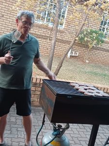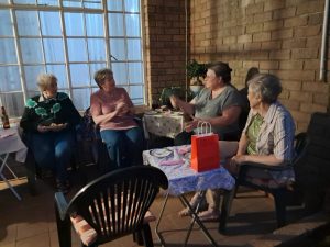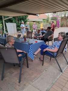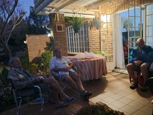 Dit is ook gebruiklik dat Johan en Linda, Chris en Sue, Dick en Ilze en Boet en Susan elke Woensdag lekker saam kuier. Elkeen bring sy eie drinkgoed en ‘n bordjie eetgoed. Daar word gesels oor vergange se dae, oorsese toere, kinders, kleinkinders, vriende en oor ons gesondheid. So het ons ‘n poeding aand gehad en ook ‘n worsbroodjie aand. Ons is almal baie gelukkig in die Oord waar ons as pensioenarisse so lekker ontspan en kuier.